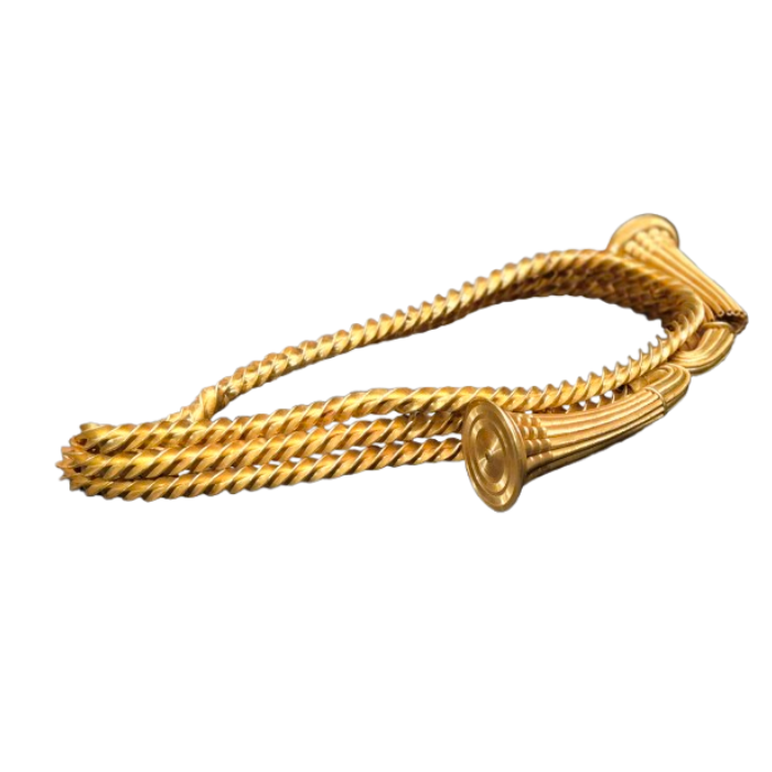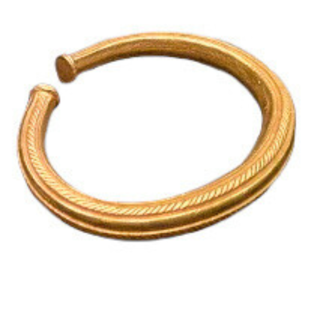 You could say that gold became the dominant material for jewelry in the Bronze Age, thanks to the discovery of metalworking techniques for precious metals. The methods used to craft and shape bronze were similar to those used for working with gold. This enabled the creation of beautiful gold jewelry, including bracelets, rings, earrings, necklaces, and large but elegant neckpieces like the torque or gorget.