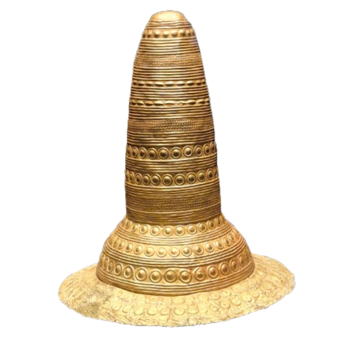 The Schifferstadt hat. This is made from a 2.5 cubic centimeter block of gold and hammered into a paper-thin gold plate. The decorations on the hat are interpreted as a ‘cosmic’ calendar, which perhaps allowed calibration of the solar and lunar year. The interpretation as a hat is due to the oval opening, brim, and attachment. They may have been religious headdresses of priests or leaders of a shared solar cult, 1600 BC.