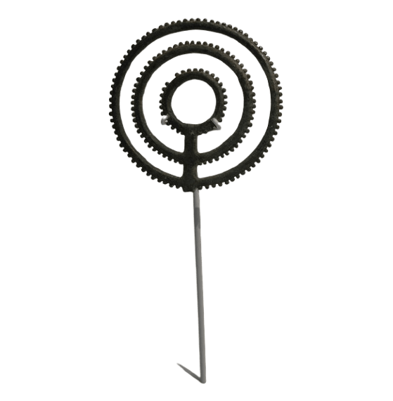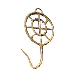 This fibula is also called a wheel needle, after the shape of the top of the pin. It is thought that the shape has something to do with a sun cult. This type of fibula was found in Western and Northern Europe, but also in Greece. This fibula is bent and sacrificed in the water of a large river, like many pieces of jewelry in the Bronze Age, which were left as a sacrificial gift. 1500-1100 BC