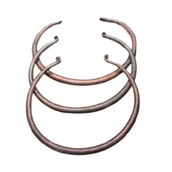 Another popular neck ornament during the Bronze Age was the torque, which came in a variety of styles, lengths, and sizes. Torques could be worn as necklaces, bracelets, rings, or even belts. Smaller torques were typically fastened by tightening them around the neck, wrist, or finger, while larger torques were connected by fastening the ends together. These ornaments served as both fashion items and decorative jewelry, worn in everyday life and also in ceremonial contexts. Many torques have been discovered in graves, often accompanying the deceased as grave goods, further highlighting their importance in Bronze Age society.