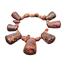 An amber necklace from the Bronze Age, buried in a grave of the Corded Ware culture, found in the Netherlands (a culture that made pots with a kind of cord motifs). This is proof of the extensive trade network at that time, since hardly any amber is found on the Dutch coast; these beads must have been imported.