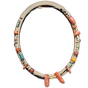 A slightly later neck ornament from the Bronze Age is the gorget. This large, collar-like piece of jewelry gives the illusion of being made from several cords of gold woven together, though it was formed from a single piece of thin gold sheet. The gorget was primarily worn in the Late Bronze Age, and like the lunula, it was decorated using the repoussé technique, in which the design is hammered into the metal from the back to create a raised pattern on the front.