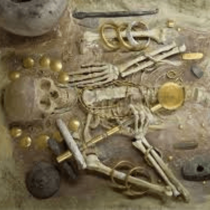 Under a burial mound in Wessex/United Kingdom, archaeologists have discovered a grave containing grave goods such as a gold pectoral, an amber necklace, and 2 daggers. It is evidence of the existence of a wealthy elite culture and international connections.