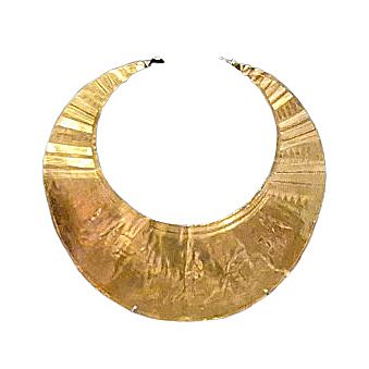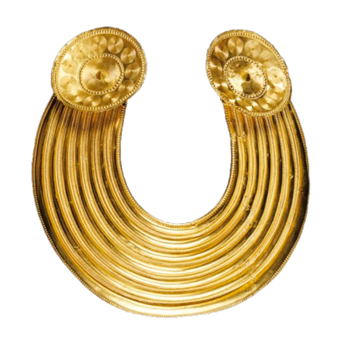 While Egypt provides one of the most iconic examples, it is far from unique. In prehistoric and early European cultures, the collar necklace appeared in the form of the torque, a solid metal ring worn around the neck. Often made from bronze or gold, the torque was rigid, heavy, and open at the front. It did not dangle or sway. It asserted itself. Archaeological evidence and visual depictions suggest that torques were worn by warriors, leaders, and figures associated with divine or heroic qualities.