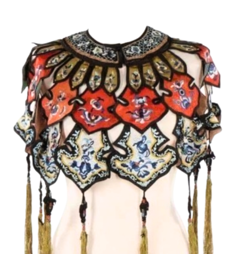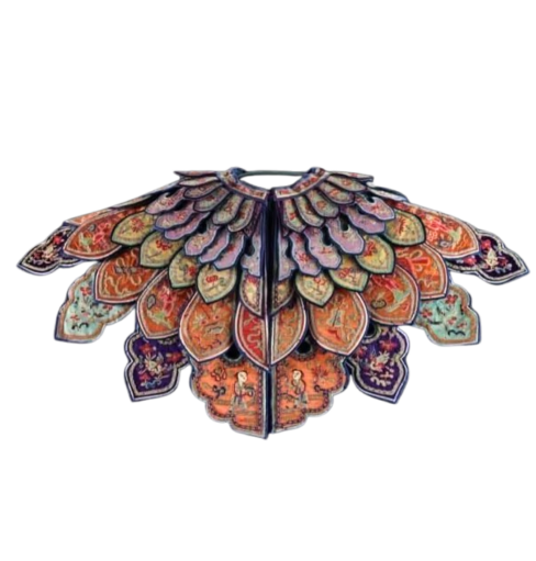 A particularly poetic interpretation of the collar form emerges in China with the development of the cloud collar, known as yunjian. Unlike many metal or bead-based examples, the yunjian was typically made from richly embroidered textile. Shaped like overlapping clouds or flower petals, it draped around the neck and shoulders, creating a soft yet powerful frame for the body. The yunjian was worn during ceremonial occasions, weddings, and formal events, especially during the Ming and Qing dynasties.
