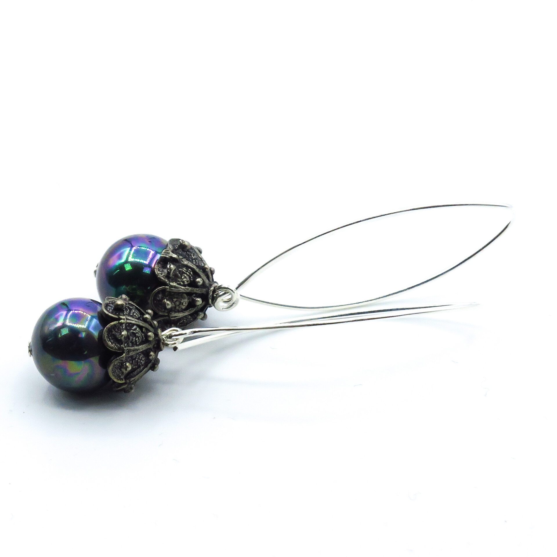 • These unique and exclusive black shell pearl earrings are made of black to grey shell pearls, Thai silver caps, and finished with sterling silver ear hooks.