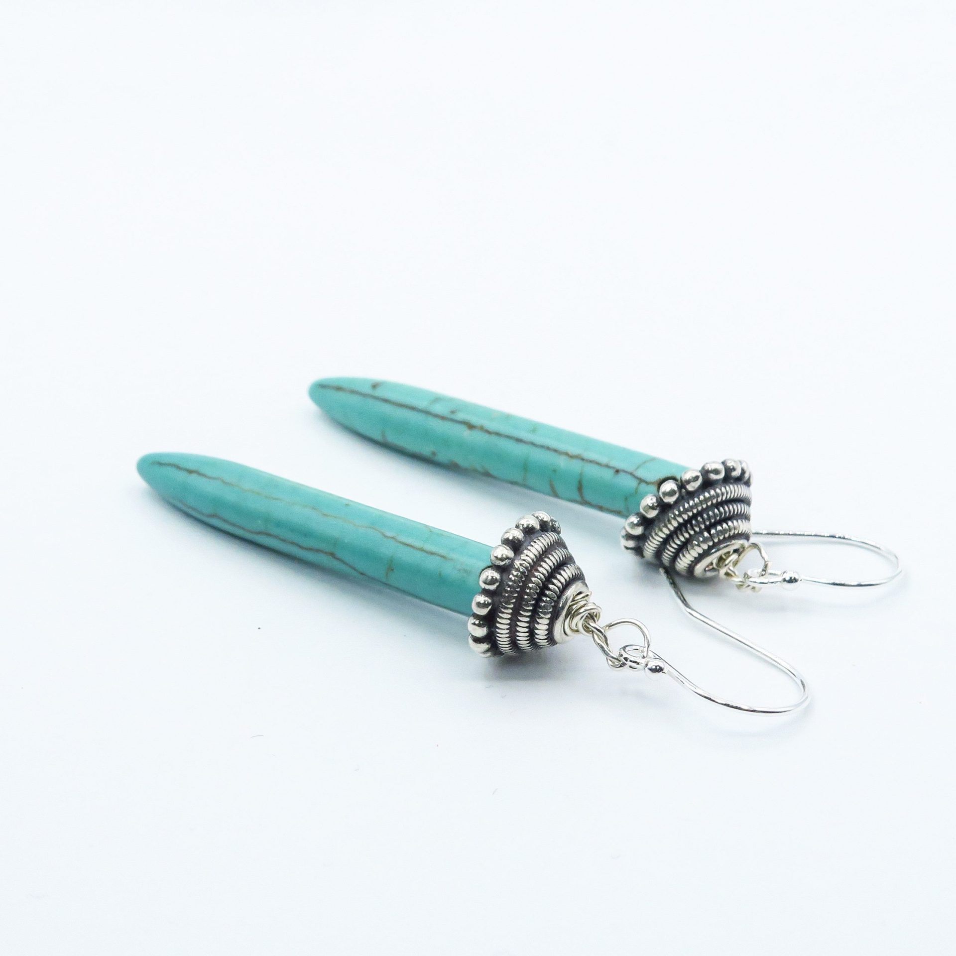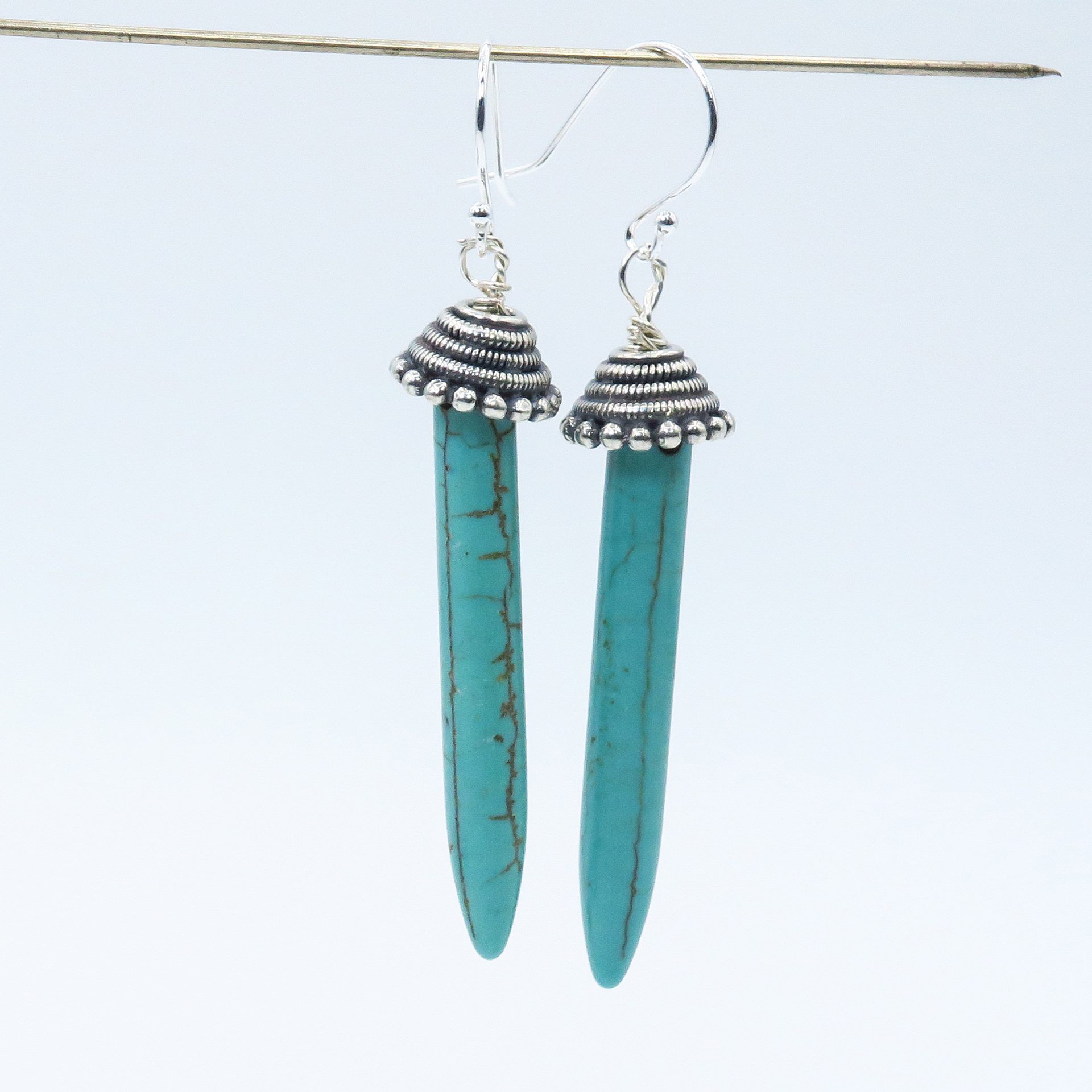 These unique and exclusive blue statement earrings are made of blue to turquoise stick-shaped howlite beads and Thai silver caps. They are finished with sterling silver ear hooks.