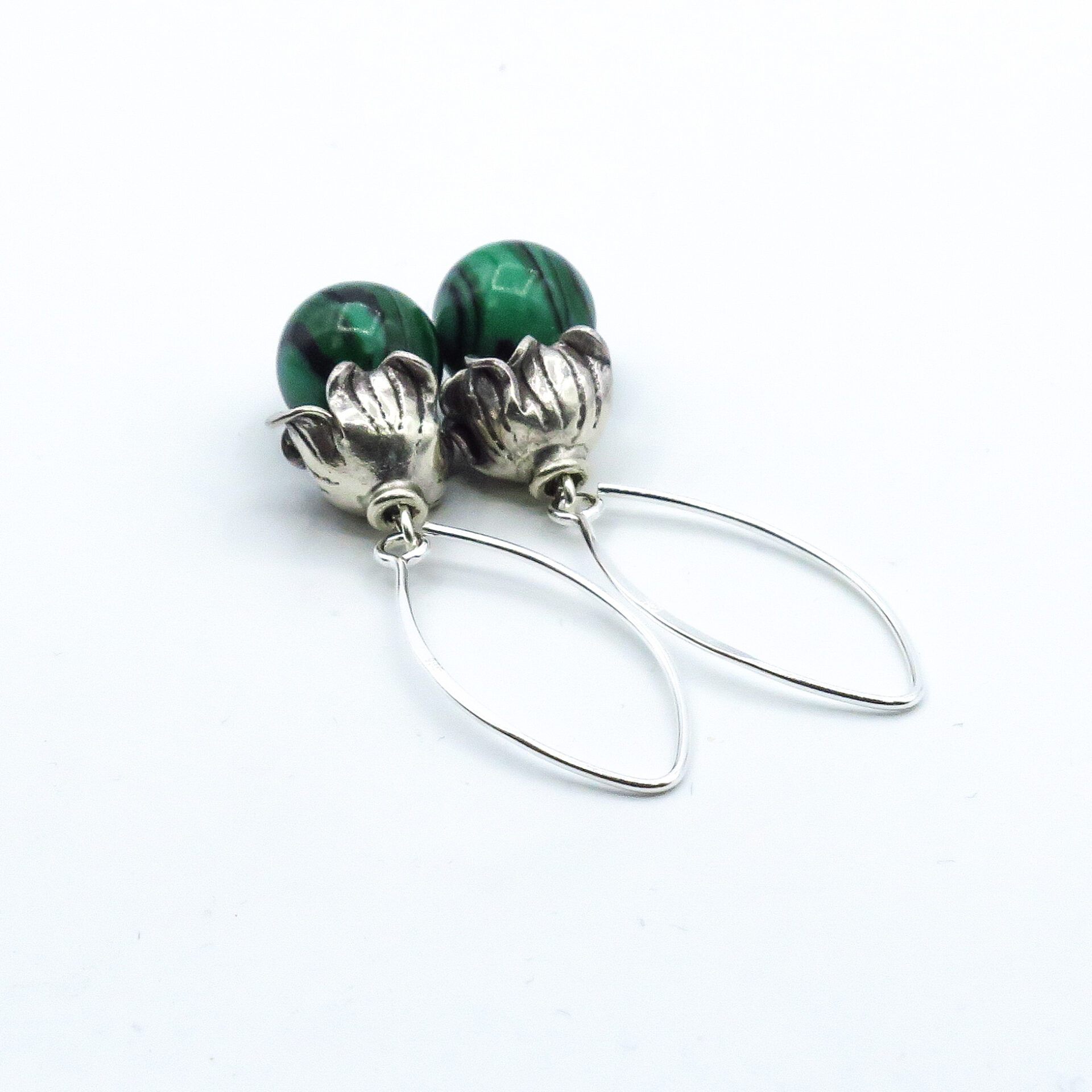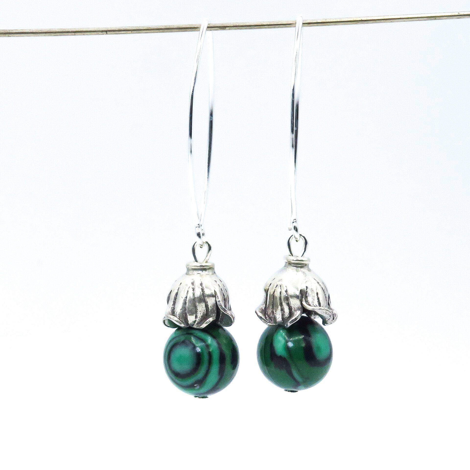 These unique and exclusive green malachite earrings are made of green malachite beads and Thai silver caps and finished with sterling silver ear hooks.