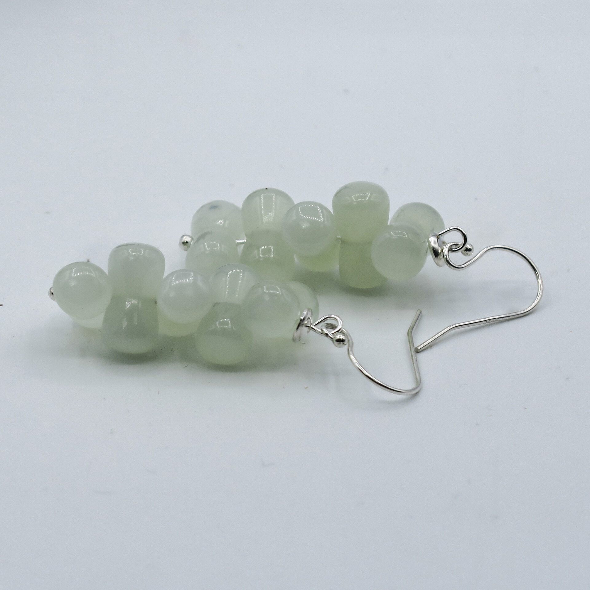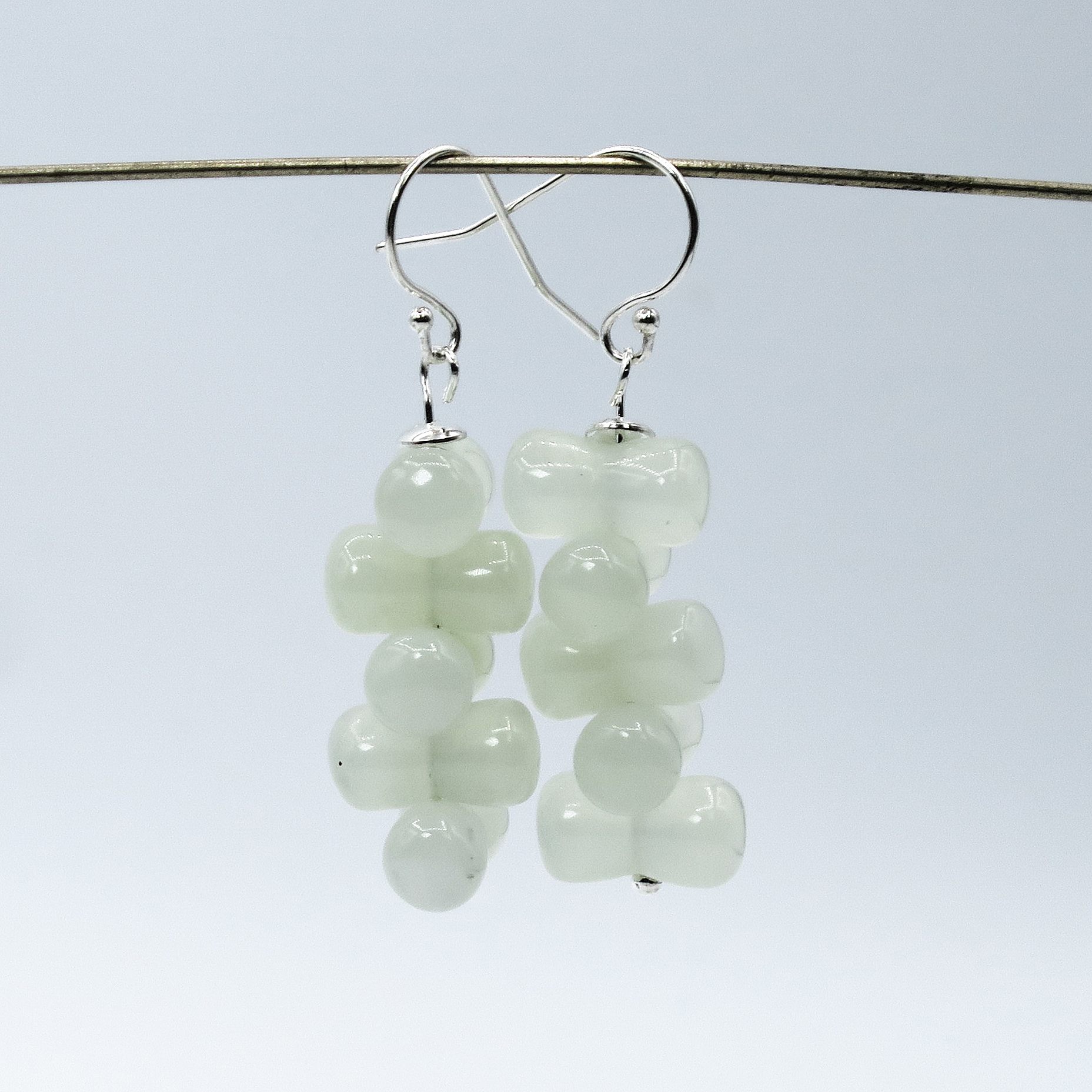 These unique and exclusive green serpentine earrings are crafted from green serpentine beads in diabolo shape and sterling silver caps, and finished with sterling silver ear hooks.
