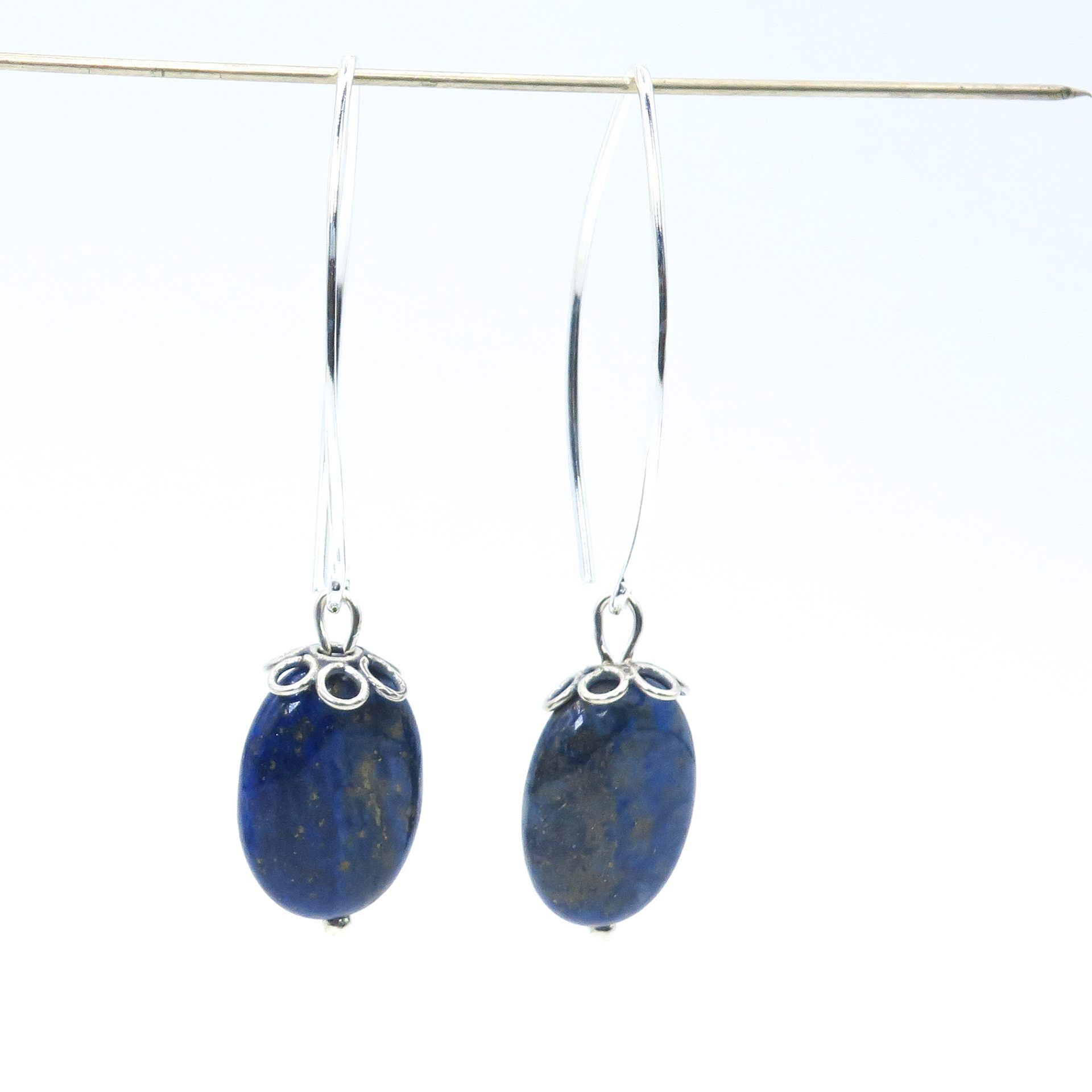 These unique and exclusive long lapis lazuli earrings are made of dark blue oval lapis lazuli beads, and silver caps, and finished with sterling silver ear hooks.