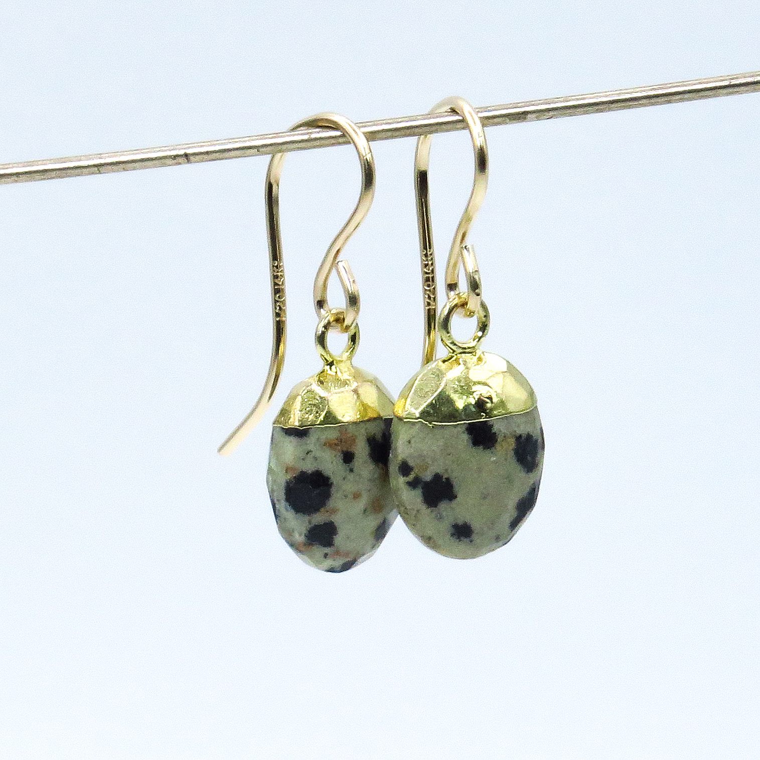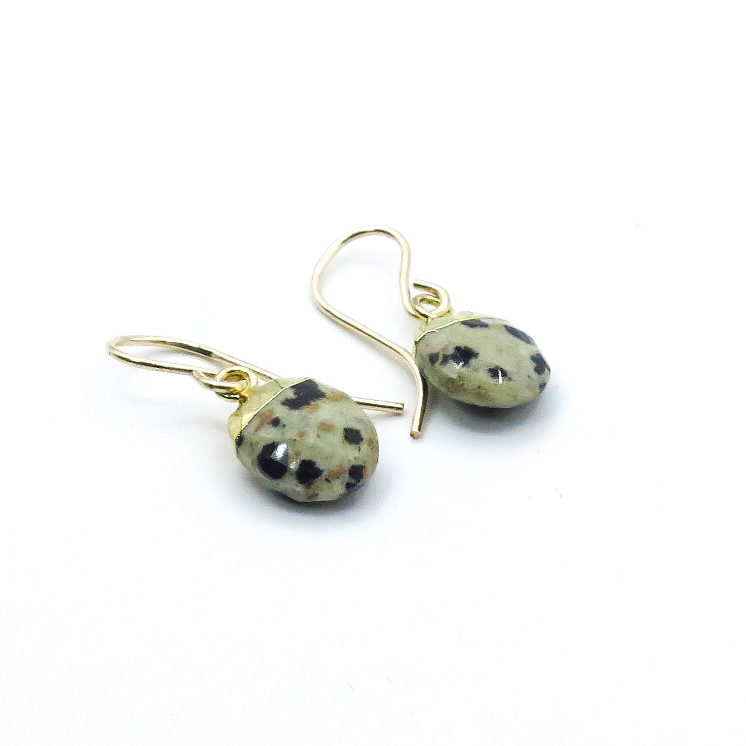 These unique and exclusive spotted jasper earrings are made of faceted grey and black Dalmatian jasper beads and vermeil caps and finished with 14K gold ear hooks.