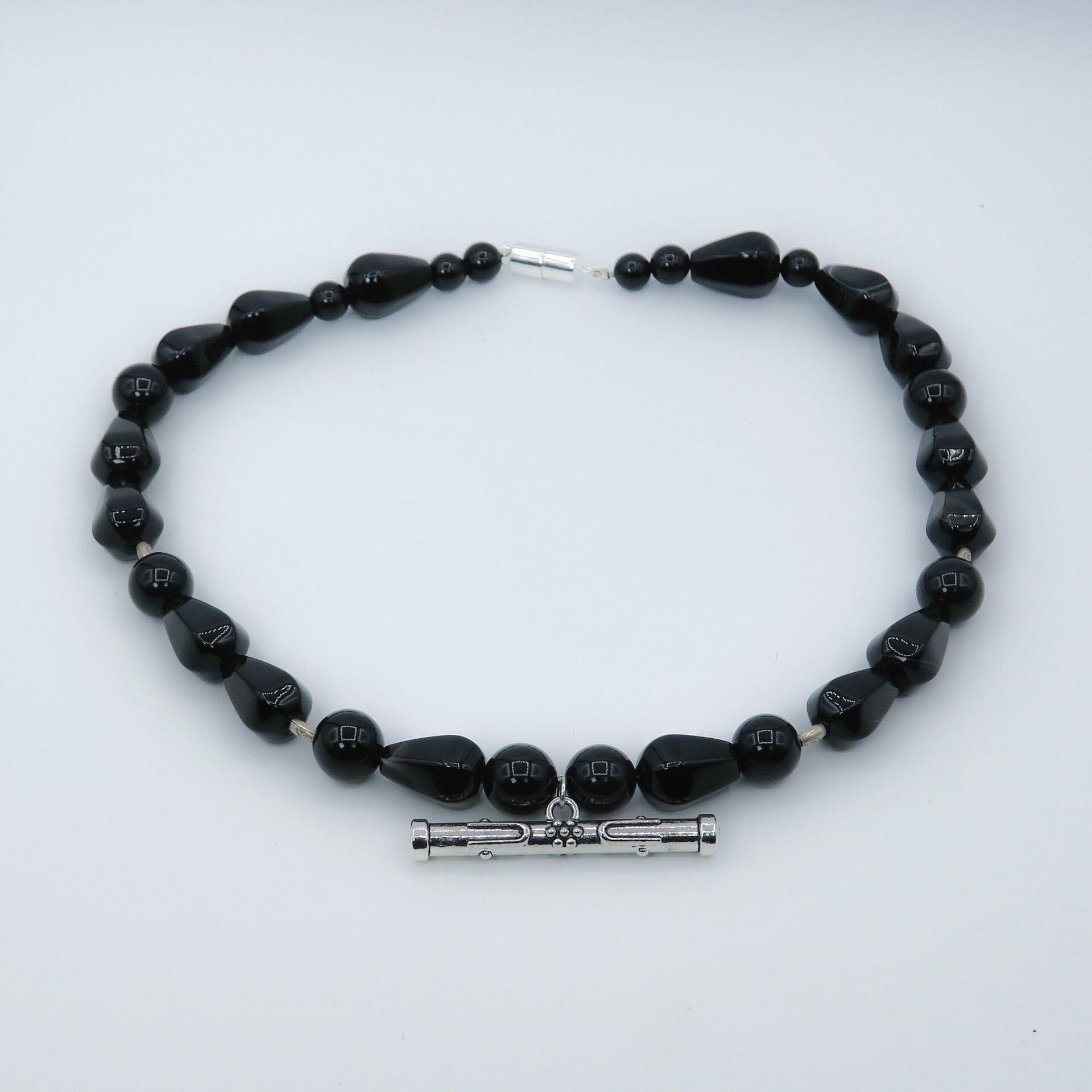 This unique and exclusive black onyx necklace is crafted from black onyx beads, Thai silver spacers, and a sterling silver pendant. The necklace is finished with a silver magnetic clasp.
