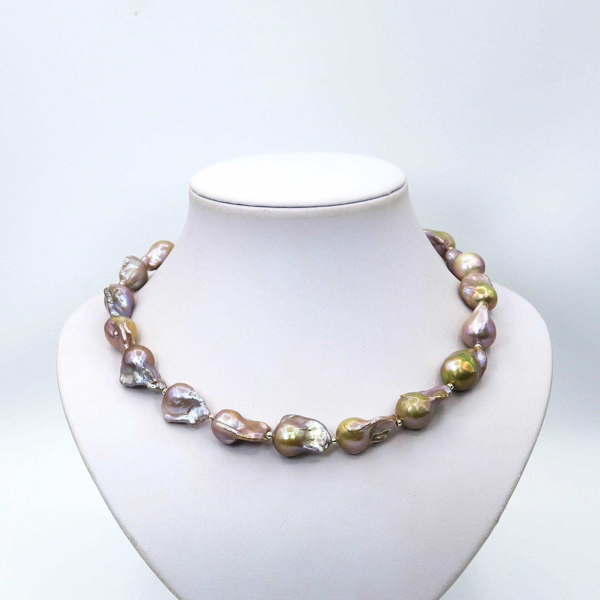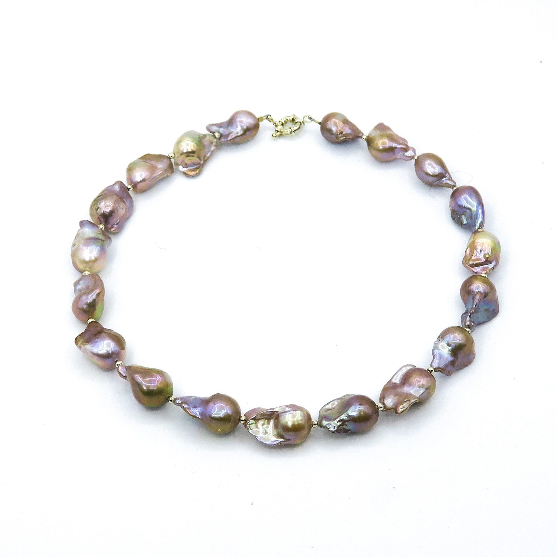 Baroque pearls are pearls that are not complety round and most of the time there is a little extra nacre on the pearl. Every baroque pearl is unique. The color of the pearls in this necklace is white to gold and lilac. Not a dull necklace!