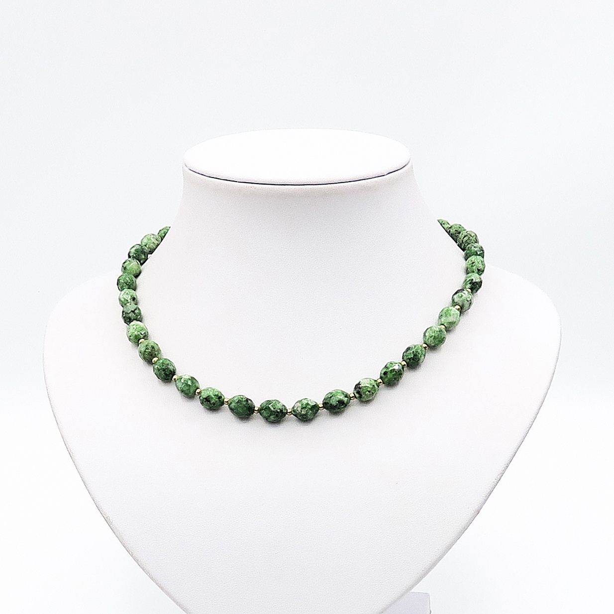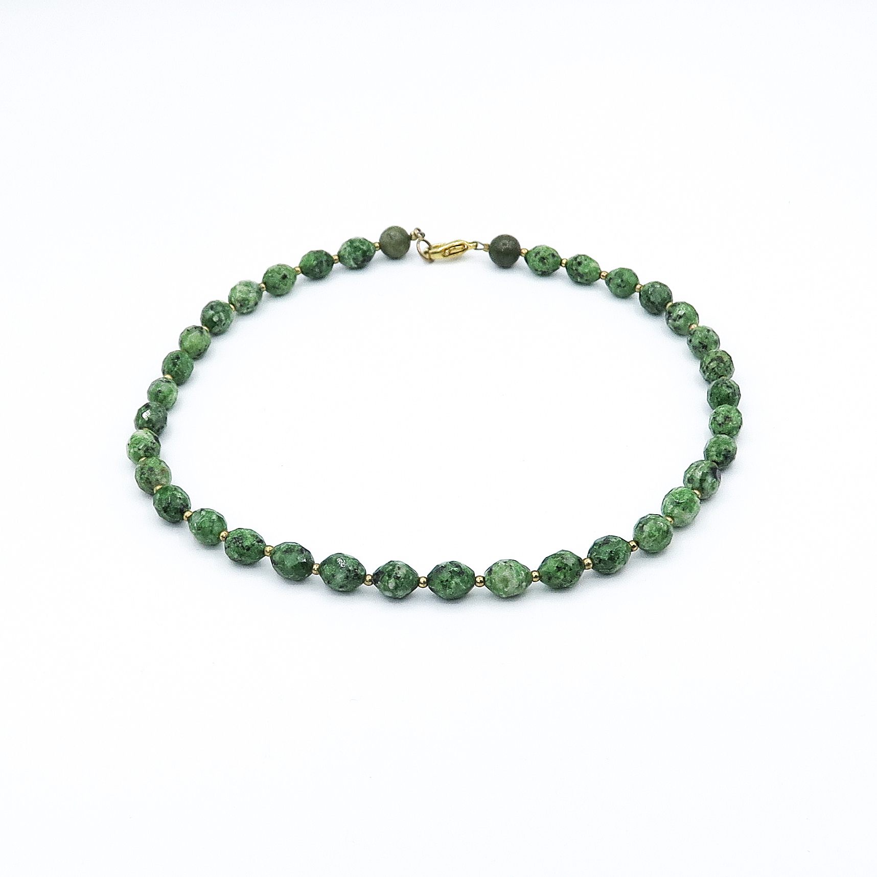This unique and exclusive green jade necklace is made with green jade beads and gold-plated spacers. The necklace is finished with a toggle clasp.