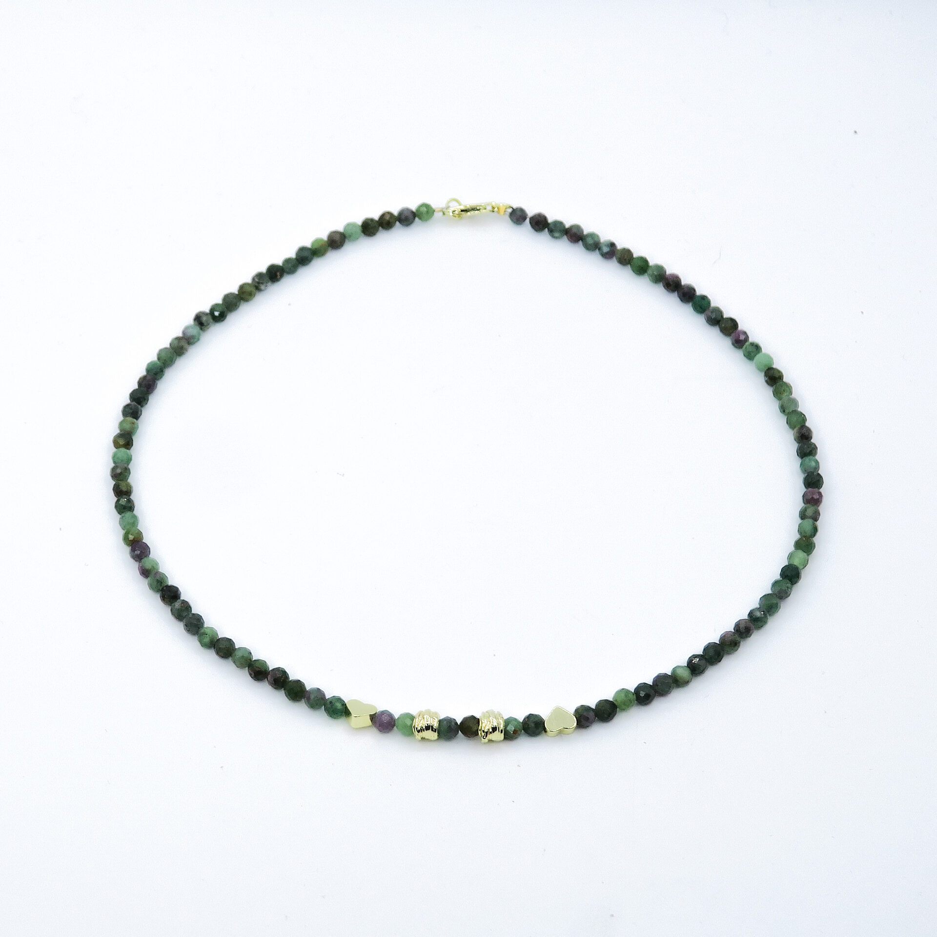 This unique and exclusive green sardonyx necklace is crafted from green faceted sardonyx beads and gold-plated spacers. The necklace is finished with a gold-plated clasp.