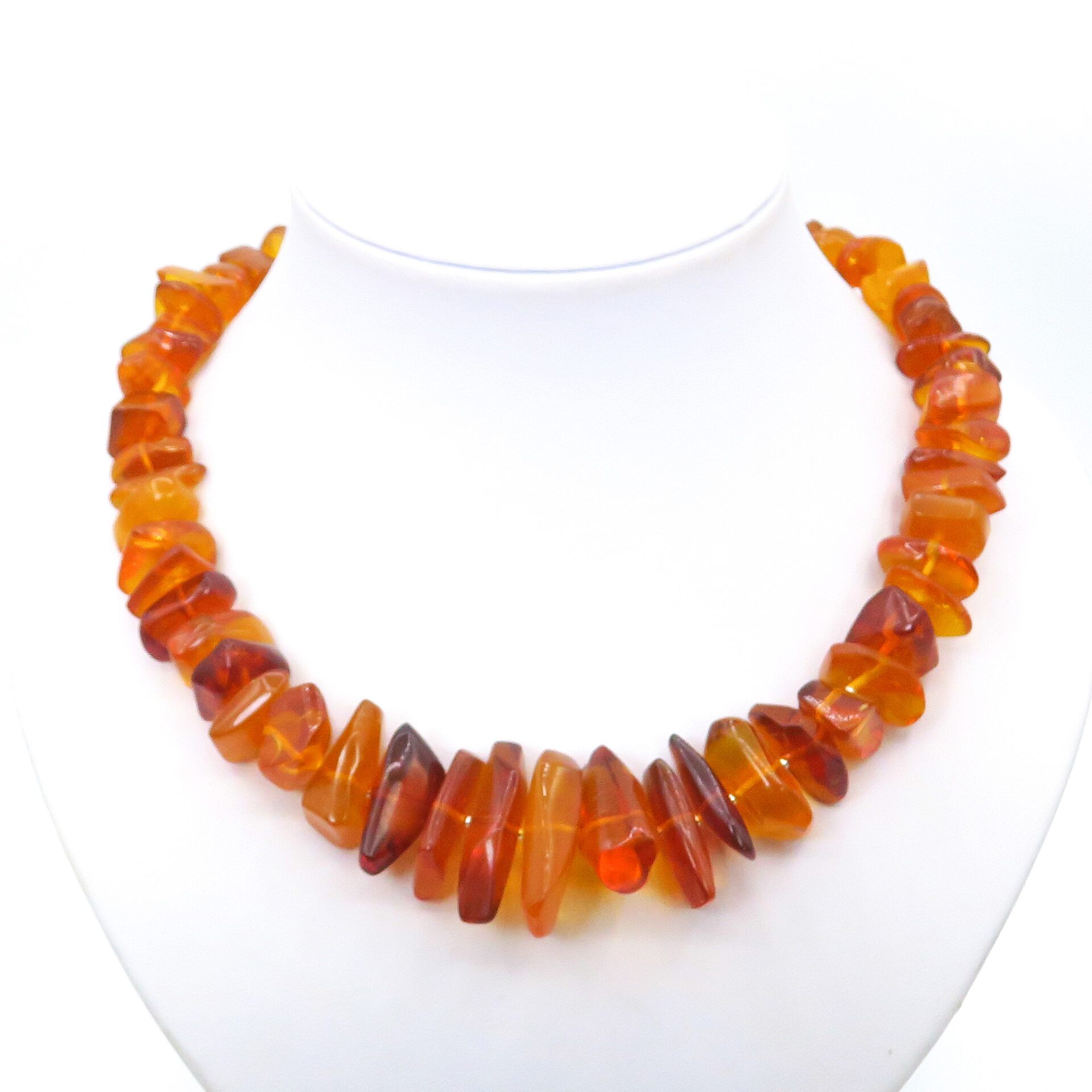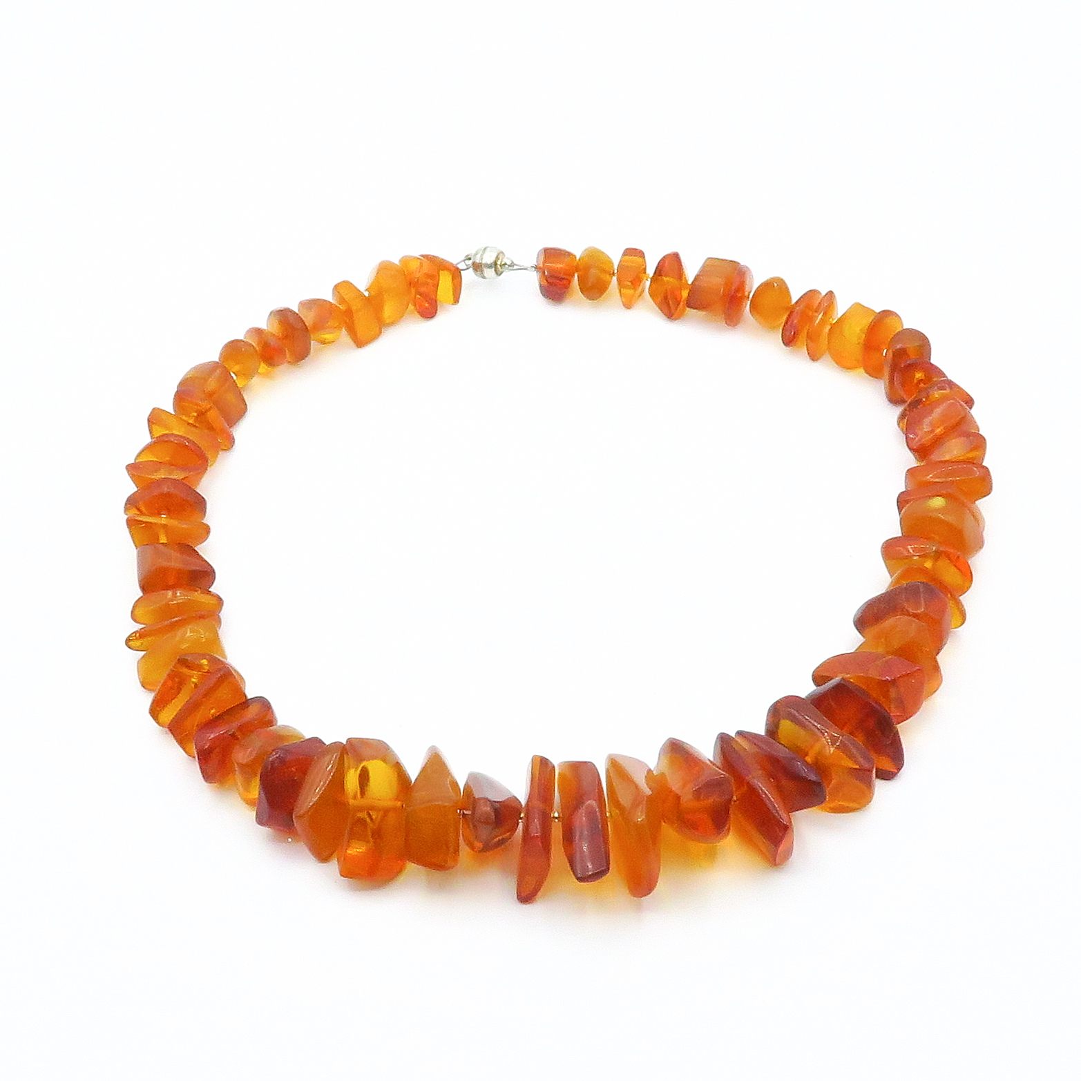 This unique and exclusive orange statement necklace is made with polished dark orange amber beads. The necklace is finished with a magnetic clasp.