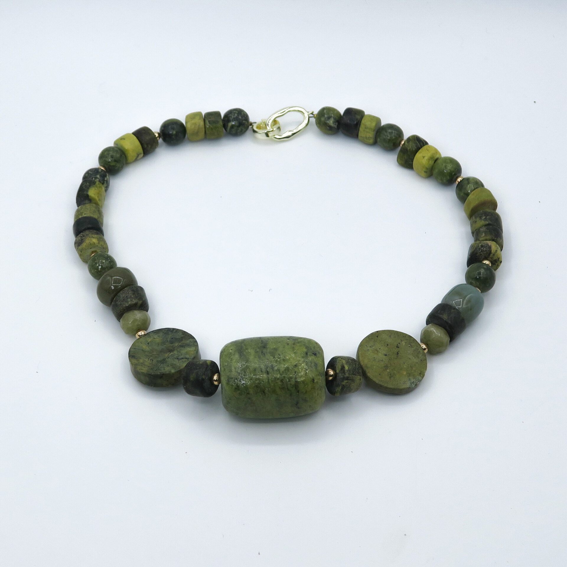 This unique and exclusive serpentine statement necklace is crafted from green serpentine beads and gold-plated spacers. The necklace is finished with a gold-plated clasp.